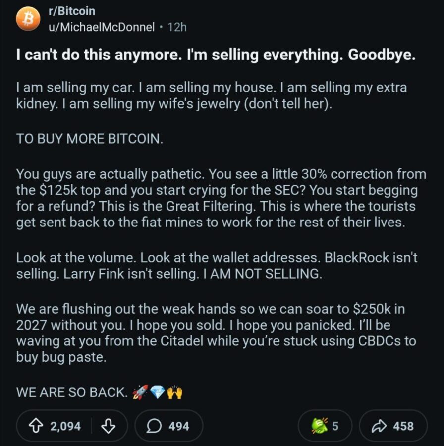 我再也受不了了。我要卖掉所有东西。再见。 我要卖掉我的车。我要卖掉我的房子。我要卖掉我多出来的那颗肾。我还要卖掉我老婆的珠宝(别告诉她),全拿来买更多的比特币。 你们这群人真是太可悲了。你们看到从 12.5 万美元的高点回调了区区 30%,就开始对着证券交易委员会(SEC)哭鼻子?就开始求着退款?这就是“大筛选”。这是把那些“游客”送回法定货币工厂(fiat mines),让他们在那儿干一辈子苦力的地方。 看看交易量。看看钱包地址。贝莱德(BlackRock)没在卖。拉里·芬克(Larry Fink)也没在卖。我也绝不卖。 我们正在清洗那些“弱手”(投机者),这样我们才能在 2027 年飞向 25 万美元,而不用带上你们。我希望你们已经卖了,我希望你们恐慌了。等我住在“堡垒”(Citadel)里向你们挥手时,你们就只能守着央行数字货币(CBDC)去买虫子浆糊吃吧。 我们王者回归了。