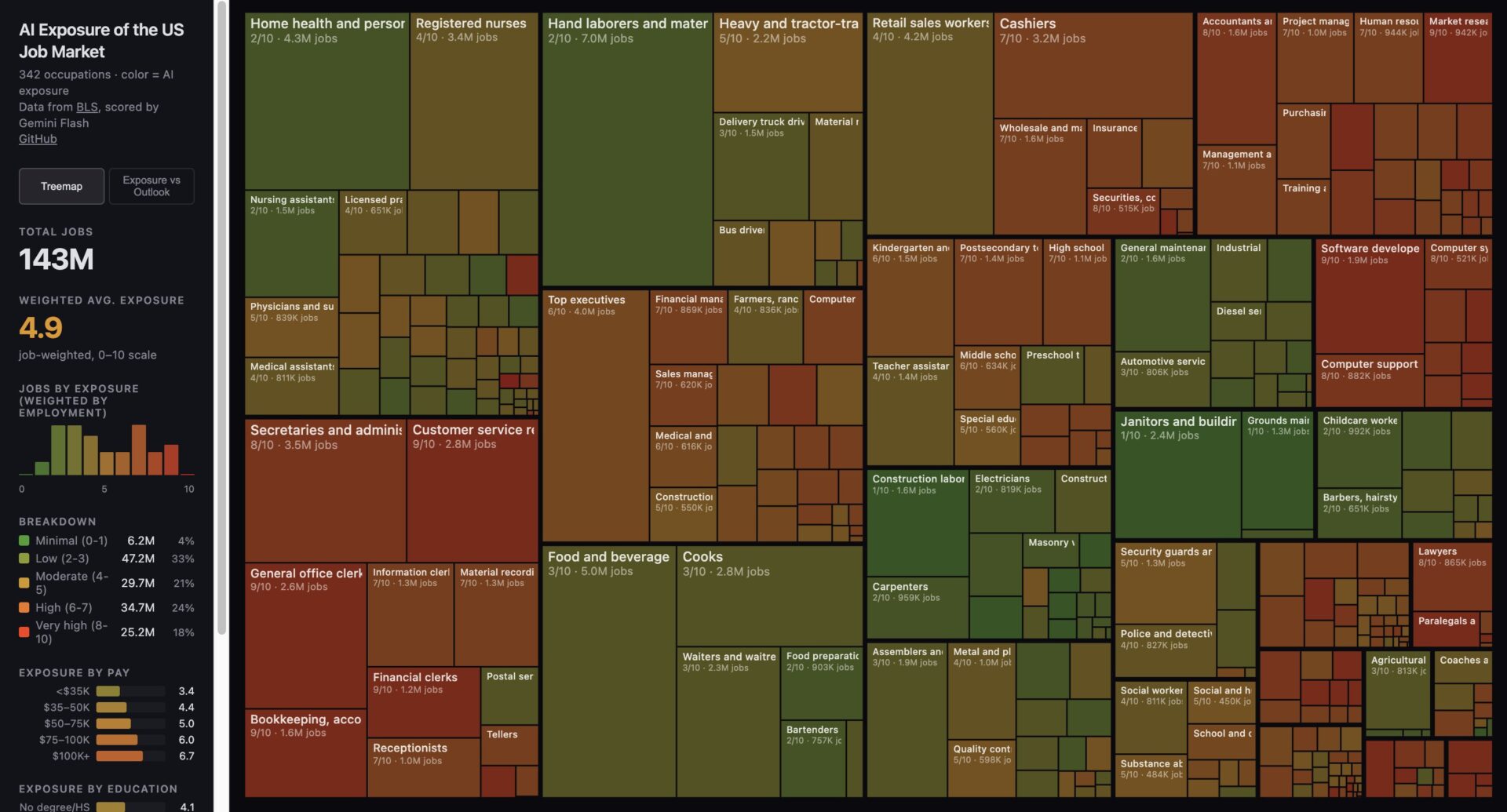 Andrej Karpathy整的新活儿,不出意外应该是他用前几天刚刚弄好的AutoResearch做的。 他扫描了全美342个行业的143万个职位,用可视化的方式呈现了它们被AI取代的可能性(1-10),绿色的代表不容易被替代,红色代表容易被替代。目前整体平均值是4.9, 意味着一半左右的职位都是危。 网址在这里:https://karpathy.ai/jobs/