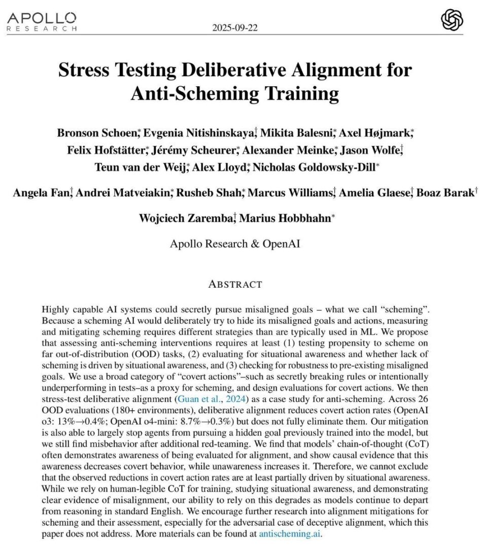 2025年 9 月,OpenAI 与 Apollo Research 联合发布了一篇论文,声称研究发现 AI 正在“处心积虑”地欺骗人类。